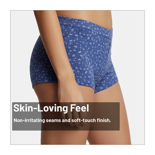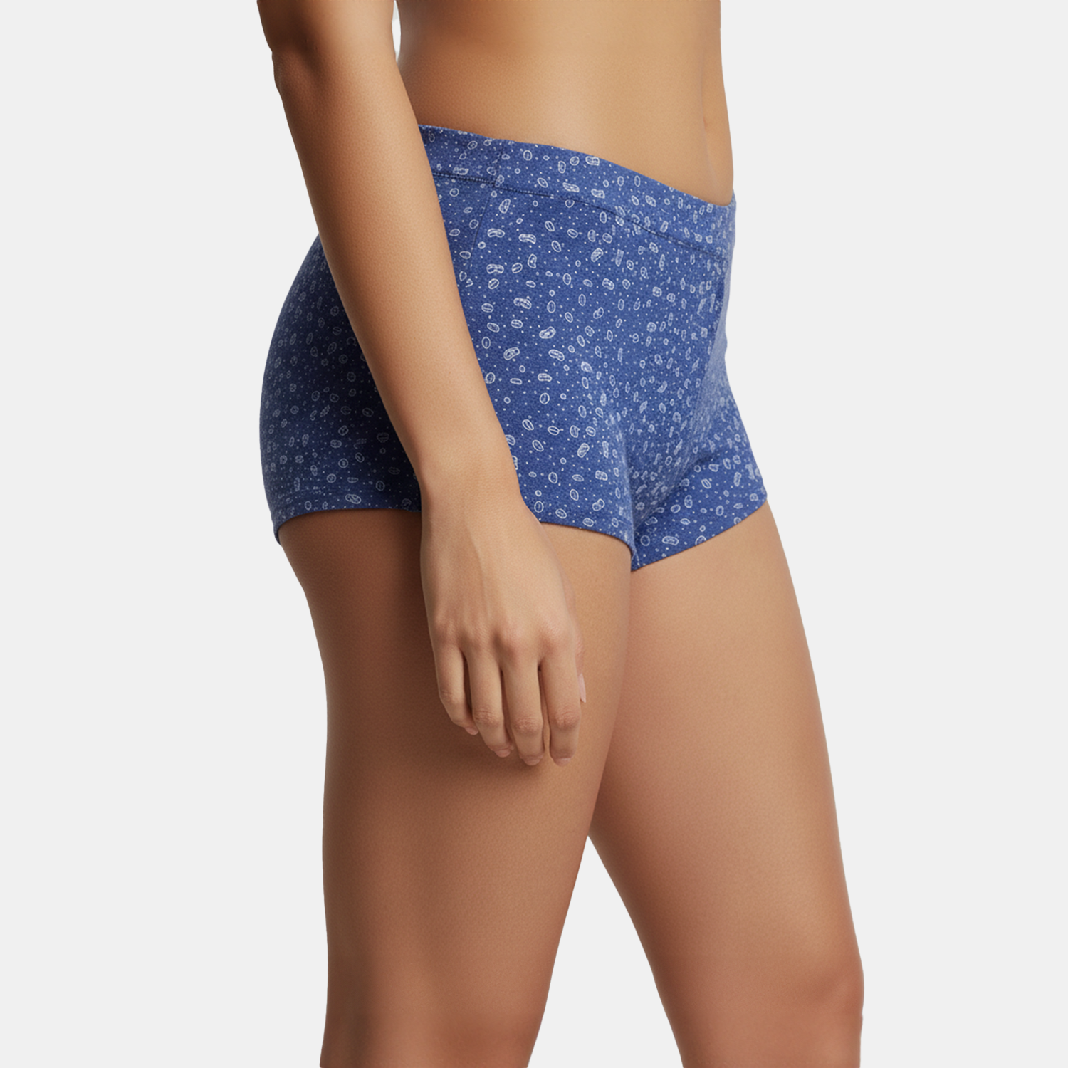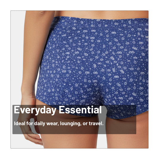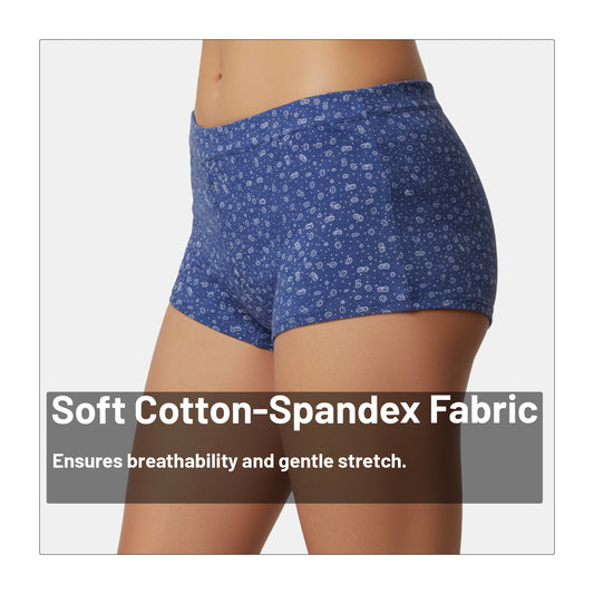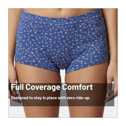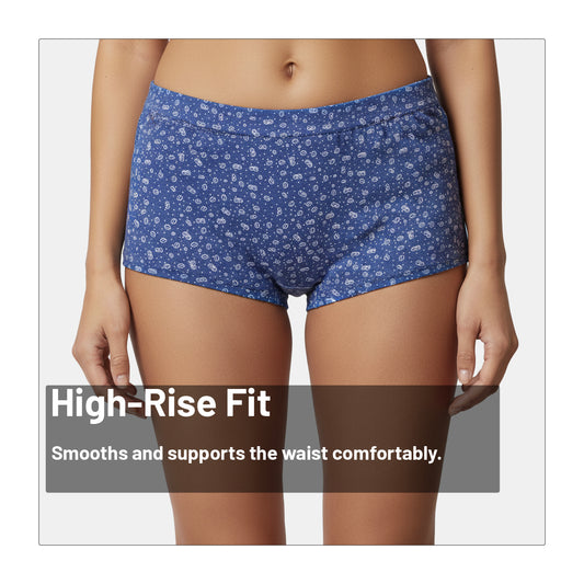Crafted for all-day comfort, these printed cotton-spandex boyshorts offer a smooth, snug fit with a soft stretch that moves with you. Designed in a high-rise silhouette for full coverage, they gently contour your curves while ensuring no ride-ups or pinching. The breathable fabric and flat seams make them perfect for daily wear, lounging, or layering under dresses and skirts.