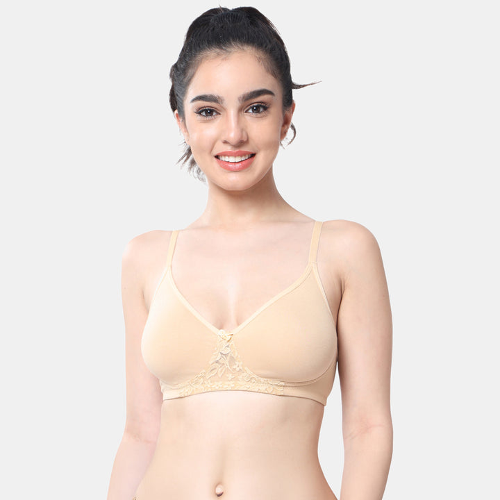 Elevate your lingerie collection with our women's basic moulded bra and experience unparalleled comfort and style. Because you deserve nothing but the best. Enjoy a natural silhouette with the freedom of movement and gentle support. Perfect for all-day wear without the discomfort of wires or padding. A touch of elegance with delicate lace between the cups adds a feminine flair, making you feel effortlessly stylish. Moulded cups conform to your shape, offering a seamless look under any outfit. Made from high-quality, breathable materials that keep you cool and comfortable all day long. Whether you're heading to work, running errands, or relaxing at home, this bra is your go-to for any occasion.