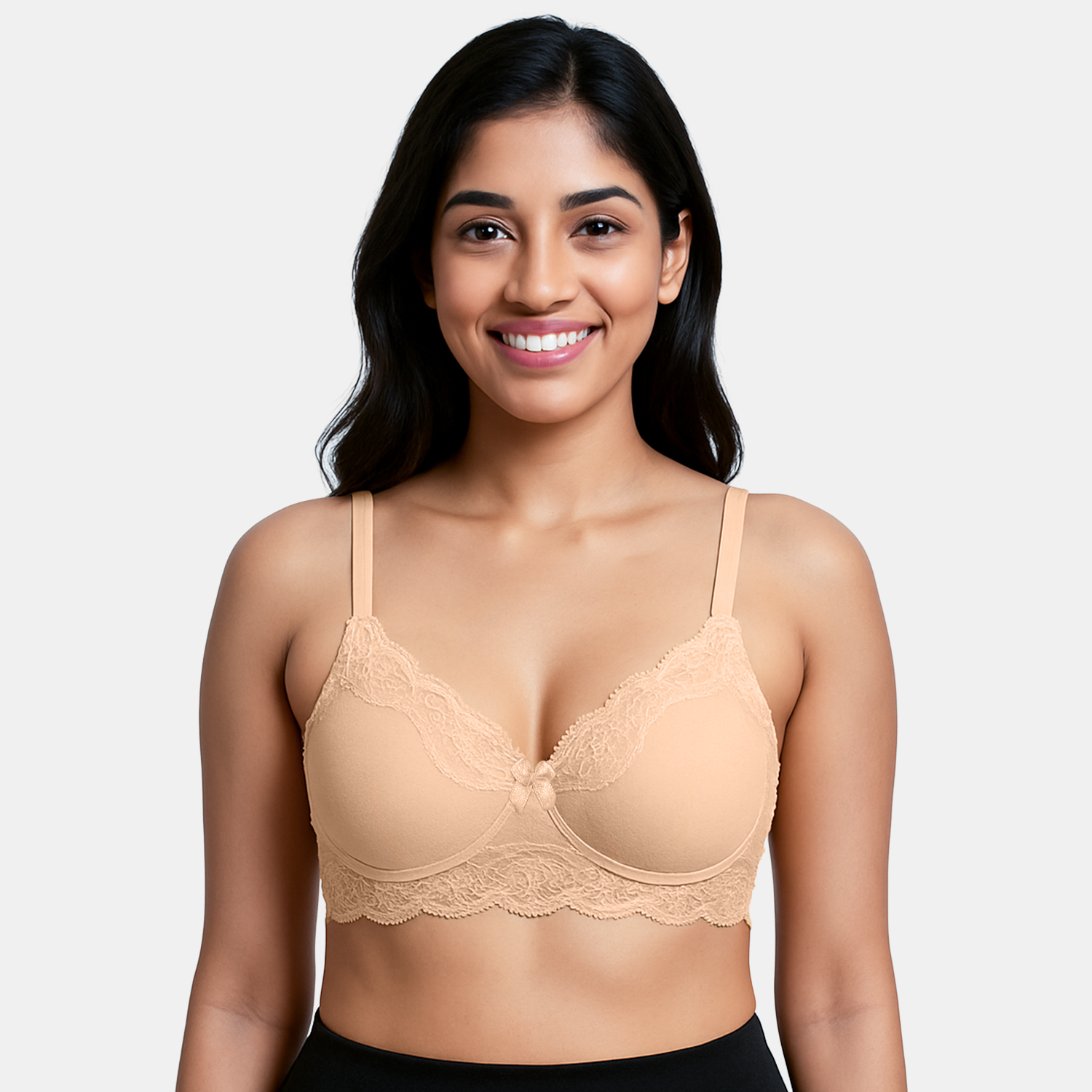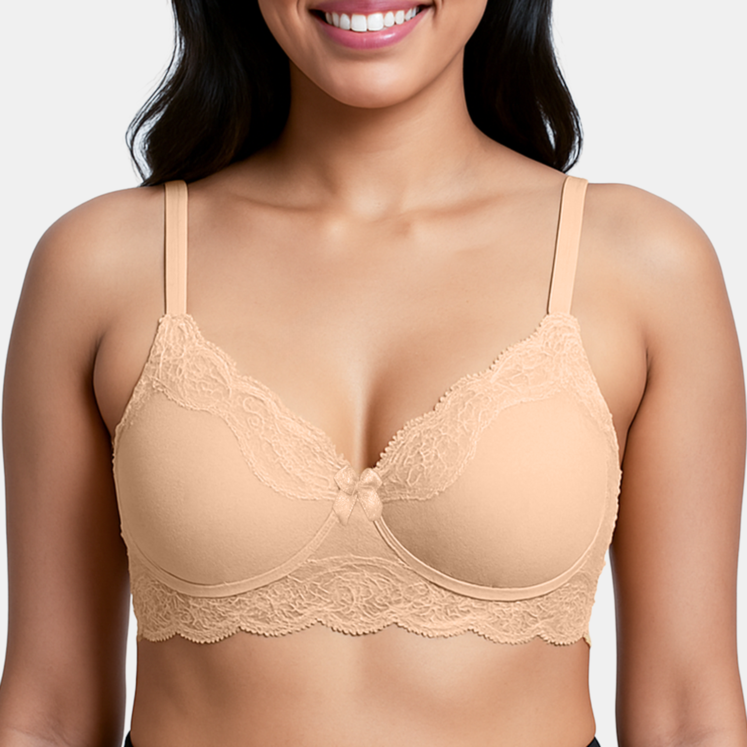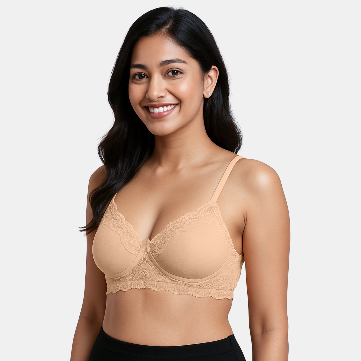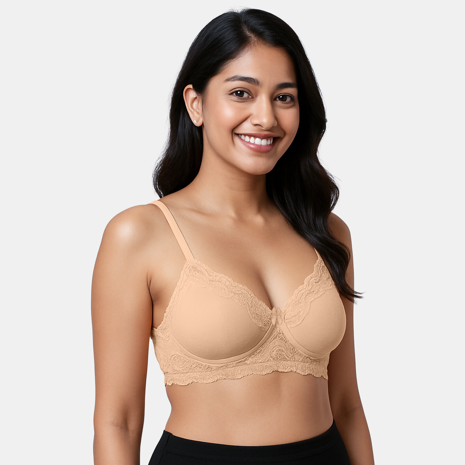 Elegant lace overlay with moulded padding for a smooth, stylish look.