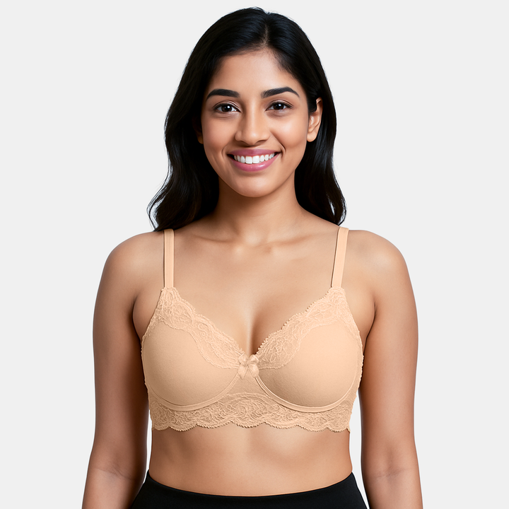 This lace padded bra combines elegance and everyday comfort. Designed with moulded padded cups, it offers a smooth, rounded shape and gentle support. The delicate lace detailing adds a touch of femininity, while the 3/4th coverage ensures a secure yet flattering fit. Crafted without wires, this bra provides all-day comfort while maintaining a stylish, supportive silhouette.