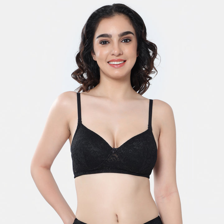Indulge in sheer elegance and unparalleled comfort with our women's lace design padded bra. Crafted to perfection, this non-wired lace bra offers a seamless blend of style and support. The wirefree design ensures all-day comfort, while the 3/4th coverage padded cups provide just the right amount of lift and shape. Featuring exquisite lace detailing adds a touch of sophistication to your lingerie collection. Designed with your comfort in mind, this bra boasts soft and smooth adjustable straps that ensure a customizable fit, allowing you to move with ease throughout your day. Whether you're lounging at home or stepping out for a night on the town, this bra offers the perfect combination of style, support, and comfort.