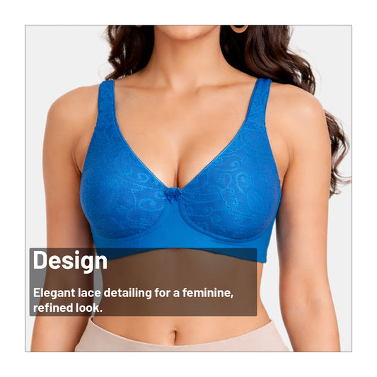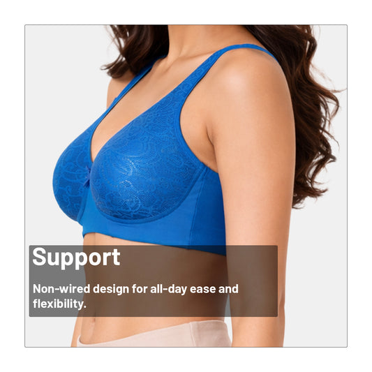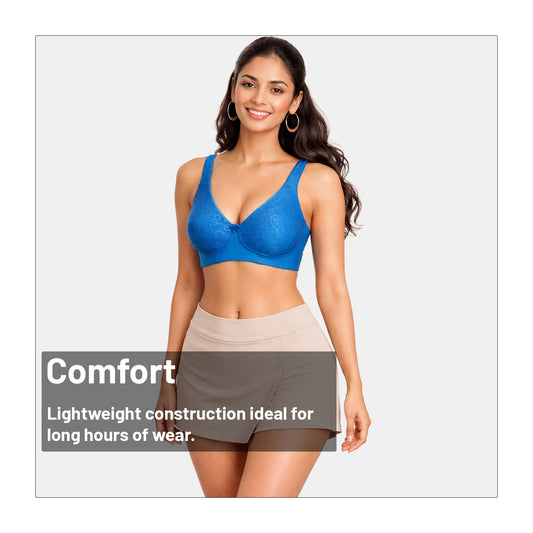 Designed for everyday comfort with a touch of elegance, this 3/4th coverage lace bra offers gentle support and a naturally flattering shape. Crafted with soft lace detailing and a breathable, non-padded construction, it follows your natural contours without adding bulk. The non-wired design ensures all-day ease, making it ideal for extended wear while maintaining a feminine and refined look.